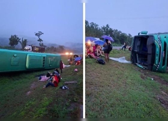 Reprodução/PowerMix Ônibus com funcionários de frigorífico tombou no canteiro central. Reprodução/PowerMix Ônibus com funcionários de frigorífico tombou no canteiro central.…