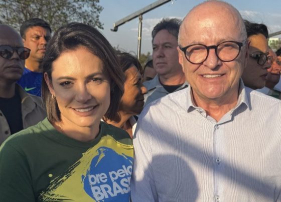 Reprodução A ex-primeira-dama Michelle Bolsonaro (PL) e o vice-governador Otaviano Pivetta (Republicanos) na marcha pela anistia em Brasília Reprodução A…