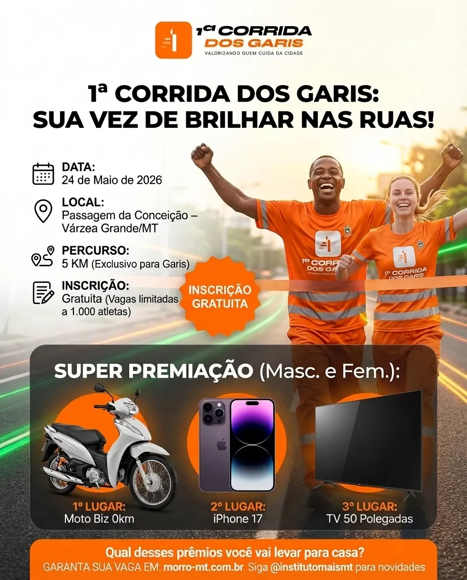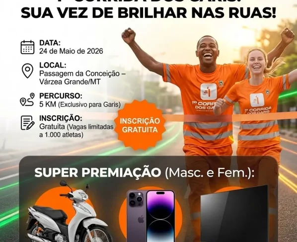 A primeira edição da Corrida do Gari já tem data marcada: será realizada no dia 24 de maio, em Várzea Grande. A iniciativa é uma homenagem ao Dia 16 de maio, que celebra os profissionais que atuam na coleta de resíduos e na limpeza urbana. O evento é promovido pelo Instituto Mais, com apoio do deputado estadual Fabinho Tardin.