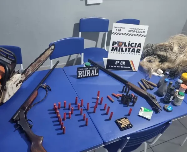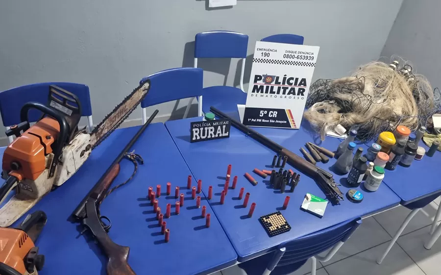 Ainda na área da fazenda, os policiais apreenderam duas motosserras sem documentação, redes de pesca e cães com ferimentos graves, compatíveis com uso em caça predatória.