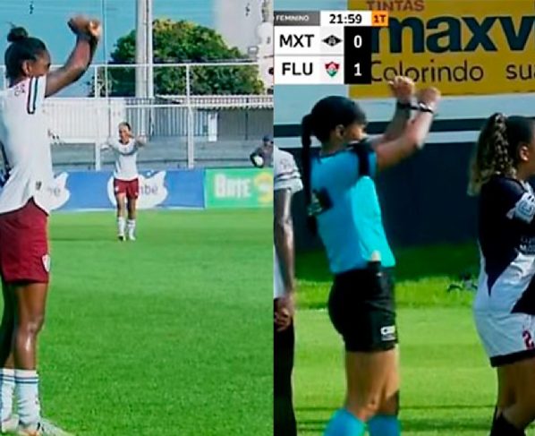 Após ser informada pelo árbitro reserva e pelo delegado da partida, a árbitra principal fez o sinal de “X” com os braços, gesto que representa a ativação oficial do protocolo antirracismo. A partida ficou paralisada por alguns minutos, enquanto a situação era apurada.